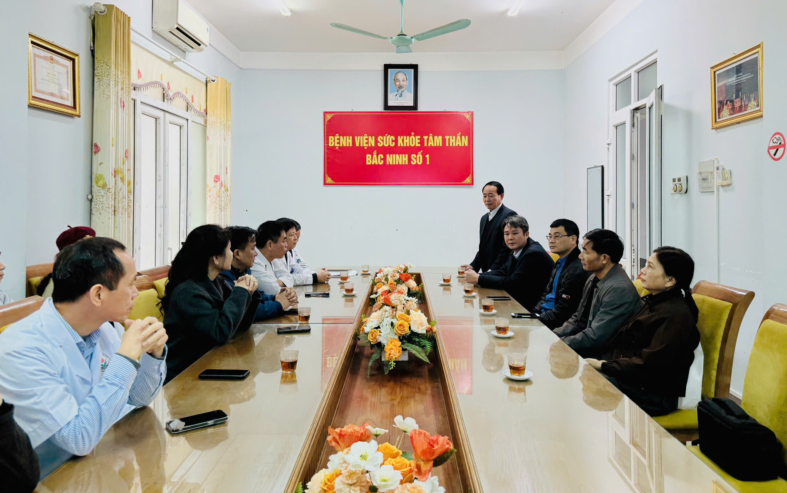 Đến thăm và trao quà có đồng chí Nguyễn Văn Định – Phó Giám đốc Sở Y tế Bắc Ninh, cùng các đồng chí chuyên viên của Sở. Tiếp đoàn có đồng chí Trịnh Xuân Tuấn – Bí thư Đảng ủy, Giám đốc Bệnh viện Sức khỏe Tâm thần Bắc Ninh số 1, cùng đại diện Ban Giám đốc và lãnh đạo các khoa, phòng chức năng.